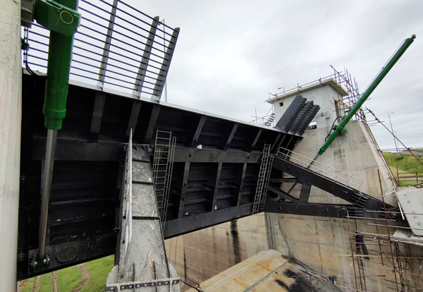 弧形閘門由3片門葉組成,重約70多噸。第一孔閘門的順利提升,鼓舞了項目全體人員的士氣,堅定了大家眾志成城高質(zhì)量完成項目的決心。